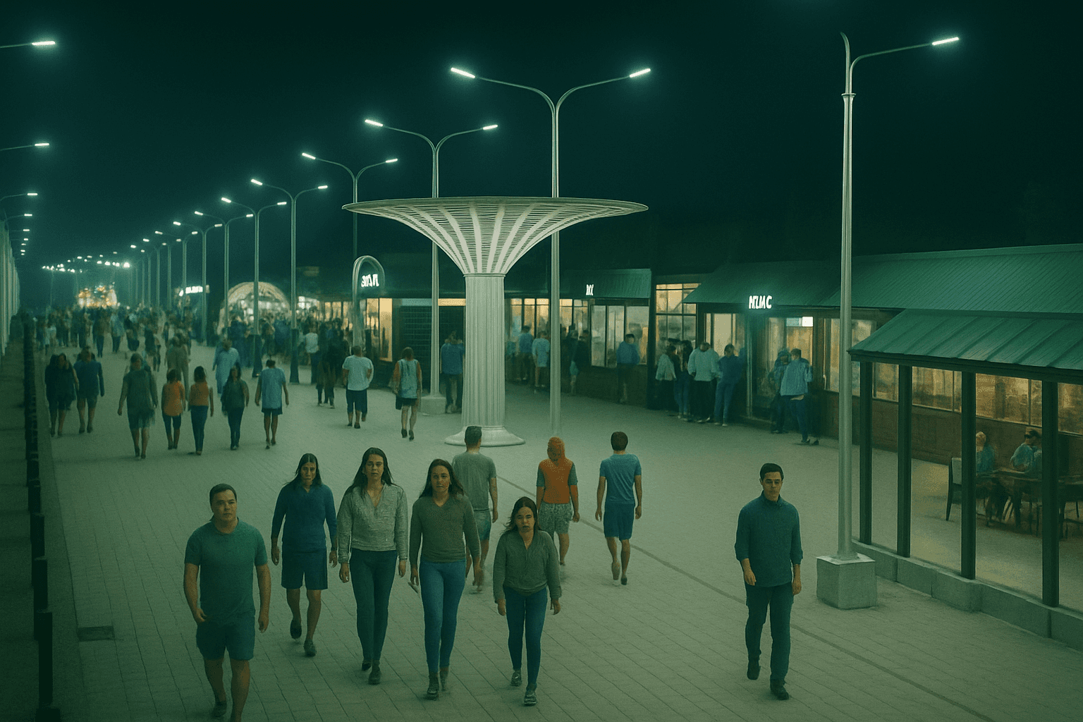 Оживлённое место в шаговой доступности с множеством аттракционов, кафе и яркой атмосферой.